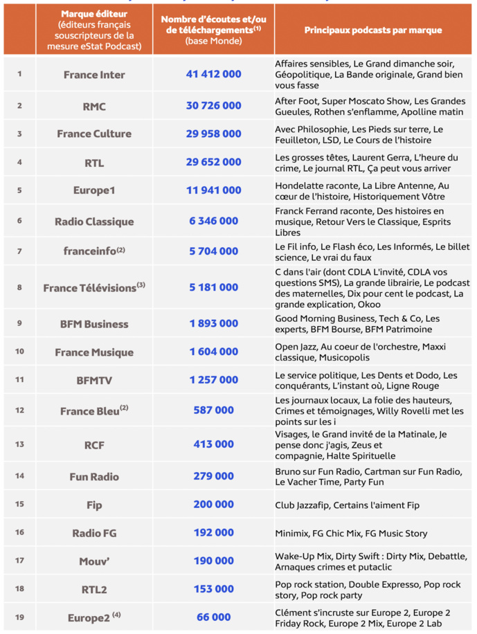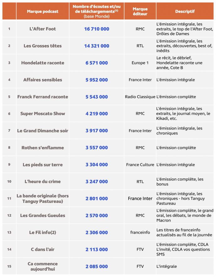 L'émission "L'After Foot" sur RMC est l'émission la plus écoutée et/ou téléchargée : : 16 710 000. Elle laisse derrière, à plus de deux millions, "Les Grosses têtes" sur RTL : 14 321 000. Suivent "Hondelatte raconte" (Europe 1), "Affaires sensibles" (France Inter) et "Franck Ferrand raconte" (Radio Classique).