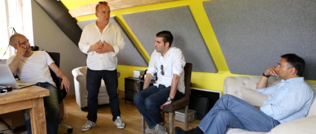 La réunion de préproduction dans le studio Soniic Design avec (de gauche à droite) Oliver Klenk, Jean-Michel Meschin, Raphaël Dauce et Dominique Lemonnier
