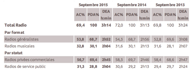 Les auditeurs néo-calédoniens sont de gros consommateurs de radio. Ils l'écoutent chaque jour durant 3h14. Les radios Généralistes (53.8) obtiennent une audience cumulée beaucoup plus élevée que celle des radios Musicales (32.8). Les radios privées commerciales (56.7) dépassent largement les stations du Service Public (31.3).