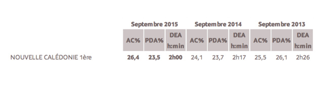 Pour autant, la station Nouvelle Calédonie 1ère génère une audience cumulée de 26.4 (en hausse sur un an) pour 23.5 de PDA. Elle enregistre également une DEA de 2h00 (en baisse continue depuis 2013).