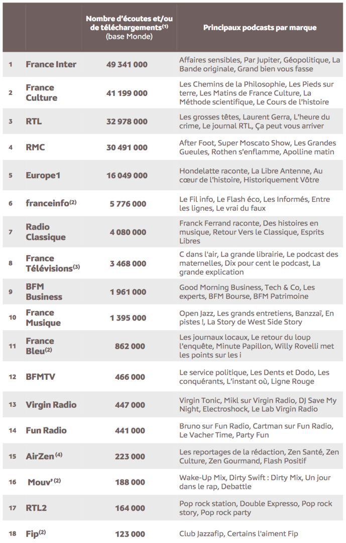 Deux radios dépassent le seuil des 40 millions d'écoutes et/ou de téléchargements : France Inter (49 341 000) et France Culture (41 199 000). Suivent RTL, RMC, Europe 1, franceinfo et Radio Classique.