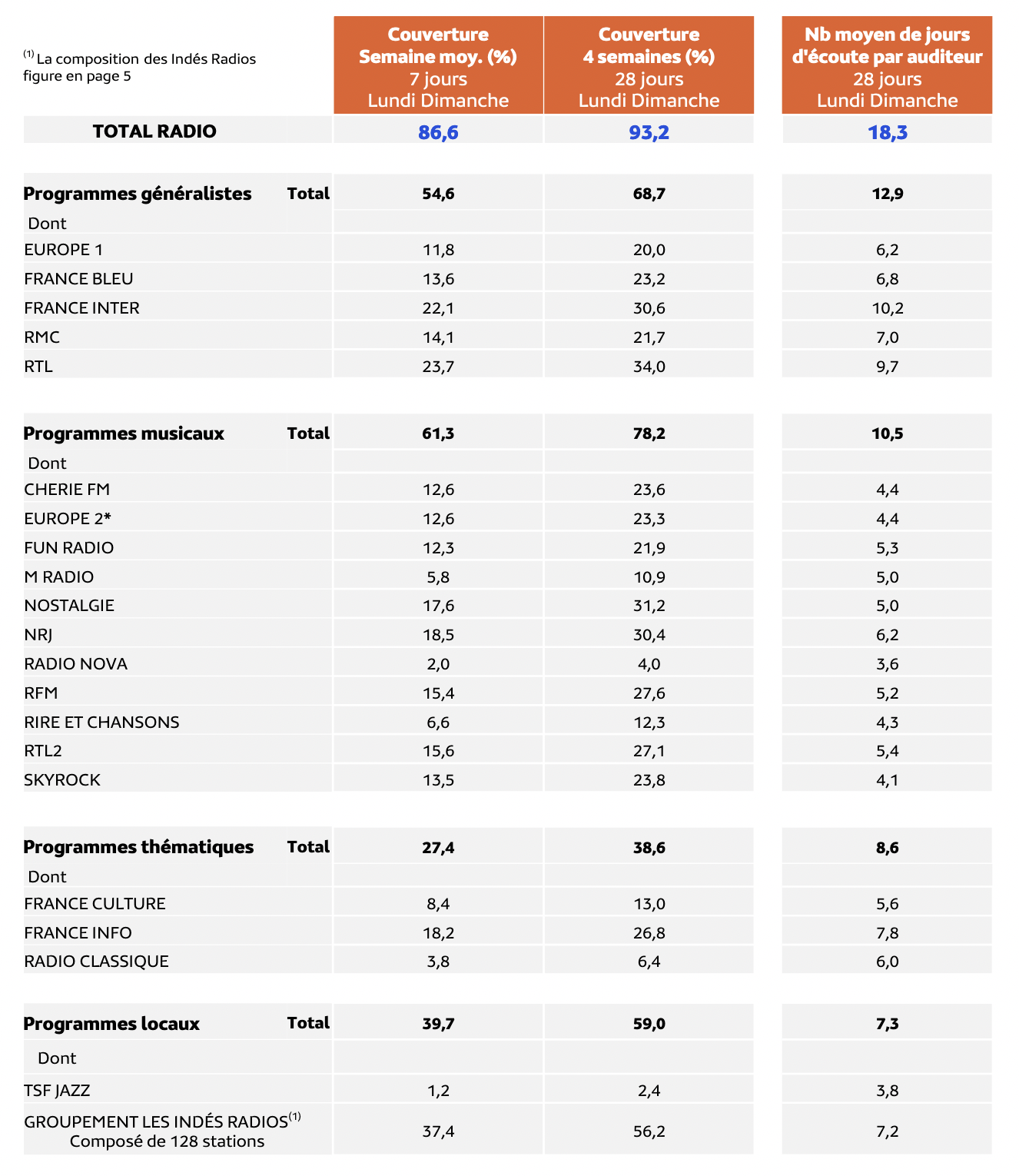 Dans la catégorie des "Programmes généralistes", le Top 5 des stations bénéficiant de la plus forte couverture sur une durée de 7 jours se compose de RTL (23.7%), France Inter (22.1%), RMC (14.1%), France Bleu (13.6%) et Europe 1 (11.8%). Sur une période de 28 jours, on retrouve RTL 34.0%), France Inter (30.6%), France Bleu (23.2%), RMC (21.7%) et Europe 1 (20.0%).