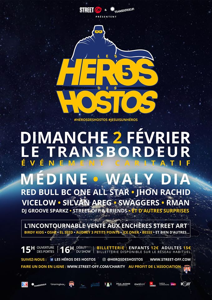"Les Héros des Hosto"s est un événement culturel hip-hop et solidaire qui a pour but de collecter des fonds en faveur des enfants atteints de cancers ou de lourdes pathologies pédiatriques. Ce spectacle pluridisciplinaire engagé est avant tout un grand moment de partage et de solidarité annuel grâce à la mobilisation des artistes et des donateurs.