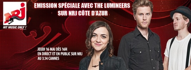NRJ s’installe avec le groupe The Lumineers à Cannes, en direct et en public, ce jeudi 16 mai. NRJ Côte d'Azur (99.2) offrira à ses auditeurs cannois un moment privilégié avec la révélation pop de l’année 2013, The Lumineers, en plein cœur de la ville.