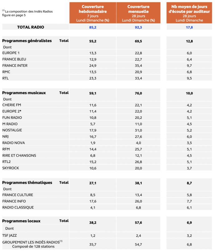 Plus de 9 personnes sur 10 (92.3 %) écoutent la radio sur un mois, soit 51.3 millions de personnes âgées de 13 ans et plus. En moyenne, les auditeurs écoutent la radio 17.8 jours par mois sur 28, quels que soient la durée de cette écoute et le support utilisé, en direct ou en replay. 81.2% des personnes écoutent la radio à domicile et 84,8% en dehors du domicile.