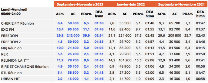 Bien que passant sous la barre des 30 points, Radio Free Dom demeure la première radio de l'île. Elle est par 212 000 auditeurs et signe 39.9% de PDA. Suivent Exo FM (13.4%), Réunion la 1ère (11.2%), NRJ Réunion (10.0%) et Chérie FM Réunion (8.4%).