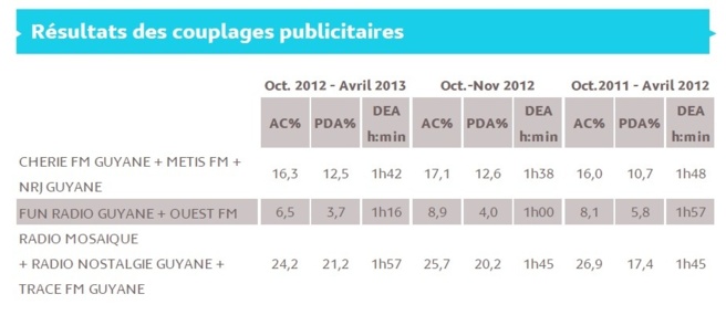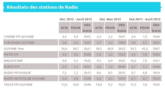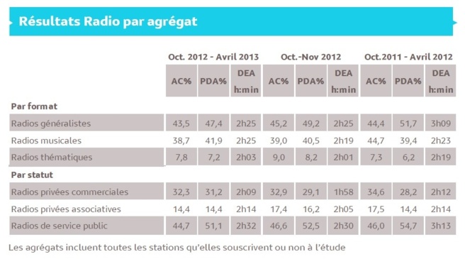 Seuls sont mentionnés dans le tableau ci-dessus les résultats des stations qui ont souscrit à l’étude au jour de parution, et dont l’audience cumulée pour un jour moyen de semaine Lundi - Vendredi (5h- 24h) atteint 2 %.
