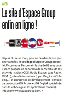 Depuis plusieurs mois, pour ne pas dire depuis plusieurs années, le seul logo d’Espace Group accueillait l’internaute. Désormais, le site dédié au groupe Espace propose un panorama de l’ensemble de ses activités : radios (ODS, Radio Espace, Jazz Radio, MFM…), sites d’informations (Lyon Mag, Lyon Clubbing…) et entreprises de développement (le studio de production EG Active et EG Digital spécialisée dans le webdesign et les applications mobiles).
