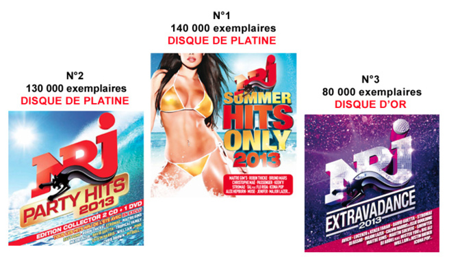 Les compilations NRJ ont dominé les ventes et les classements tout l’été. La compilation NRJ Summer Hits Only 2013 s’est écoulée à 140 000 exemplaire (disque de Platine), la compilation NRJ Party Hits 2013 à 130 000 exemplaires (disque de Platine) et la compilation NRJ Extravadance 2013 à 80 000 exemplaires (disque d’Or). Dans les bacs depuis le 26 août, la compilation NRJ Hits 2013 Volume 2 est entrée directement n°1 des ventes de compilations en France.