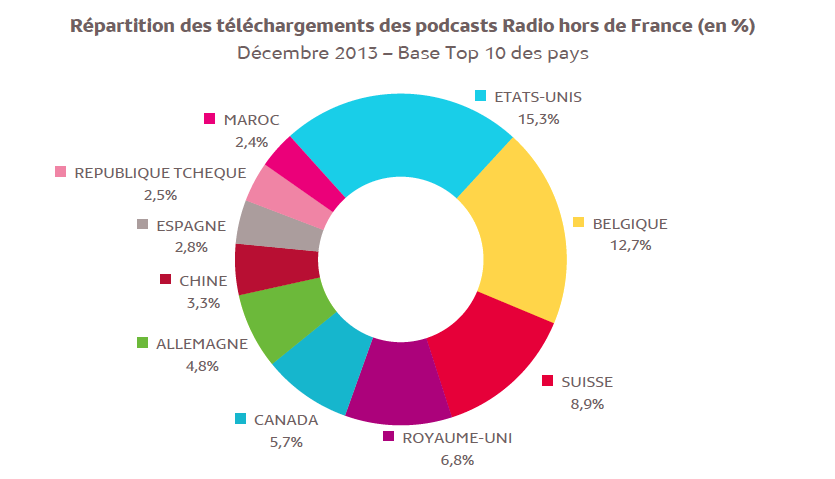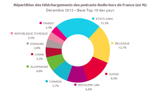 Juste derrière, se classent des pays francophones comme la Belgique et la Suisse qui représentent respectivement 12,7% et 8,9% des podcasts téléchargés hors de France. Le Royaume-Uni compte quant à lui près de 7% des téléchargements, devant le Canada (5,7%) et l'Allemagne (4,8%). A noter également, la présence de la Chine, avec 3,3% des podcasts téléchargés hors de France et de la République Tchèque.