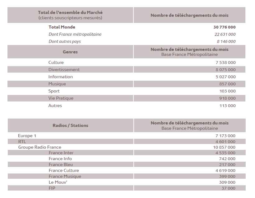 Sur les 30,8 millions de podcasts téléchargés dans le monde au mois de décembre sur les stations mesurées (Europe 1, RTL et les stations du Groupe Radio France) plus de 8 millions de podcasts, soit plus d’1 sur 4 (26,5%) ont été téléchargés en dehors de la France métropolitaine.