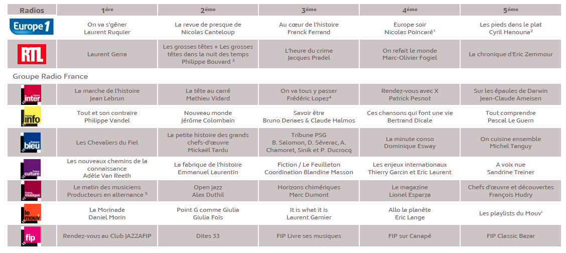 Sur RTL, Laurent Gerra, Philippe Bouvard et Jacques Pradel tiennent le haut de l’affiche. Enfin sur France Inter, et sans surprise, La Marche de l'Histoire, La Tête au Carré et On va tous y passer sont les rendez-vous les plus téléchargés.