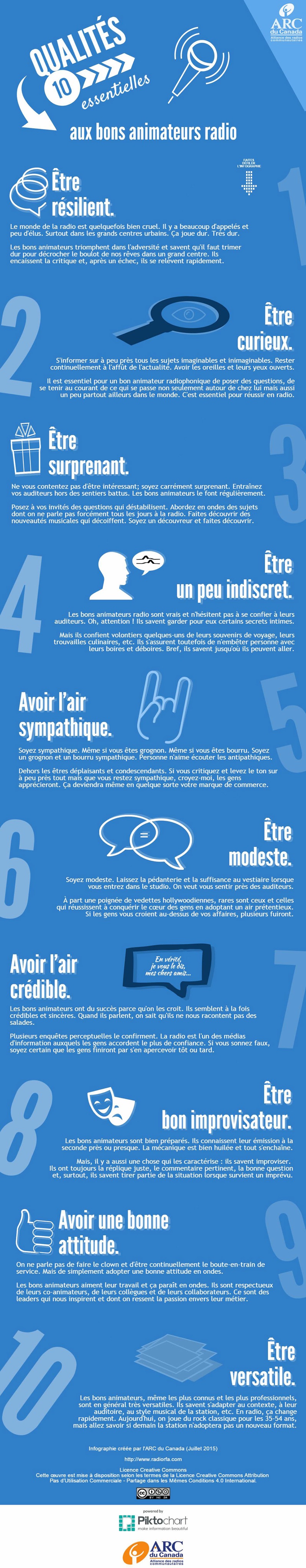 L'ARC du Canada (Alliance des Radios Communautaires) a publié une surprenante infographie qui met en exergue les "qualités essentielles aux bons animateurs radio". Curiosité, sympathie, modestie ou encore crédibilité... Seraient-elles quelques-unes de ces qualités indispensables qui font de vous un bon animateur radio ?Brulhatour est le rédacteur en chef du magazine La Lettre Pro de la Radio et le directeur associé... En savoir plus sur cet auteur