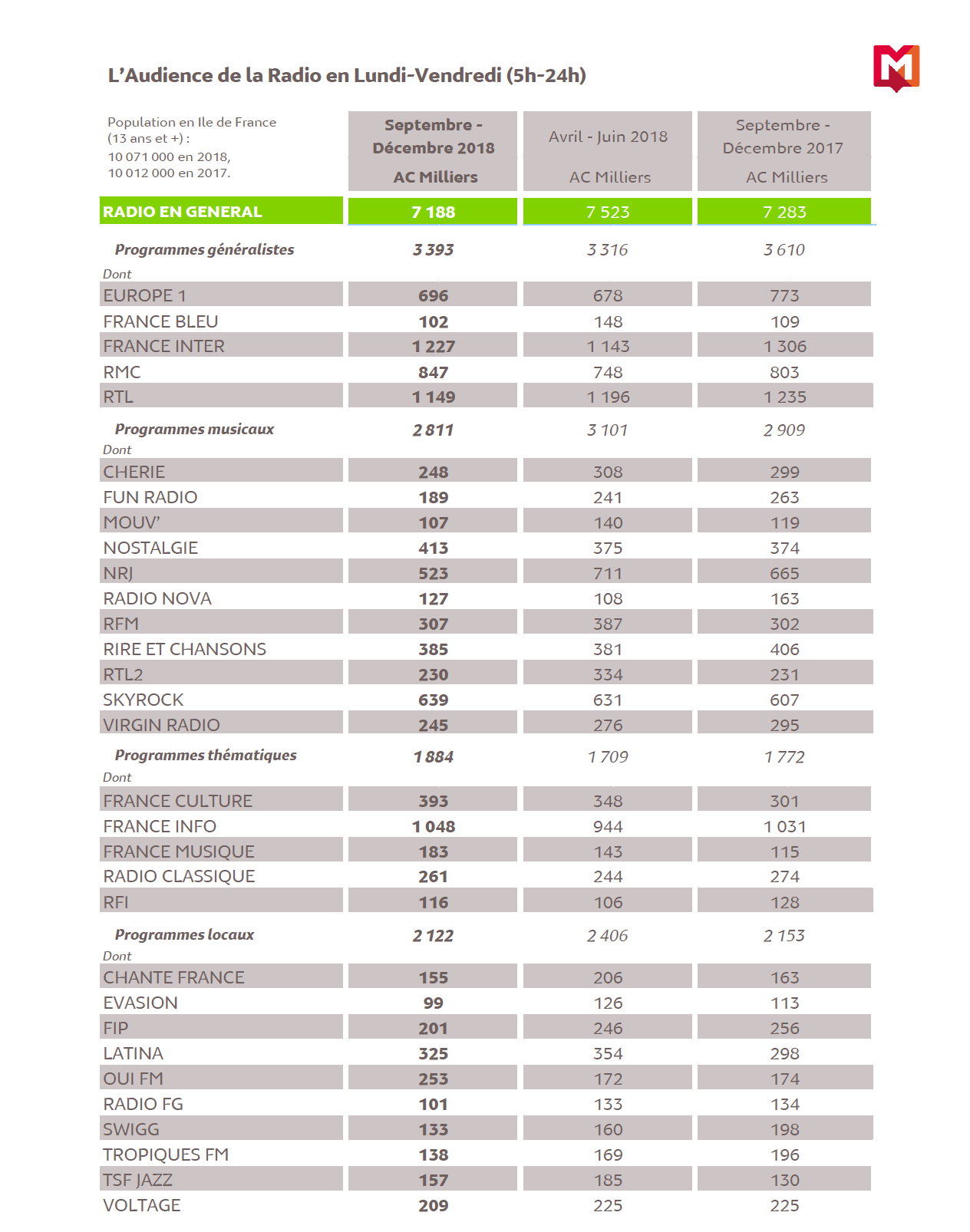 Les résultats en milliers d'auditeurs