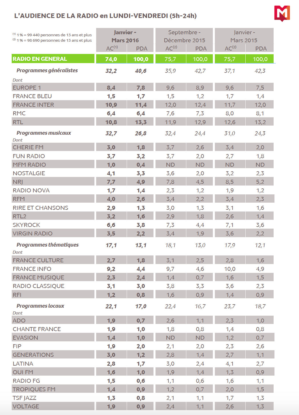 Rappelons que la 126 000 Radio est la mesure d'audience de référence de la radio en France. Elle fournit la mesure permanente de l'audience "Dernières 24 heures" de la Radio et des stations en France, ainsi qu'une description des auditeurs selon les critères socio-démographiques, de consommation et de niveau de vie.