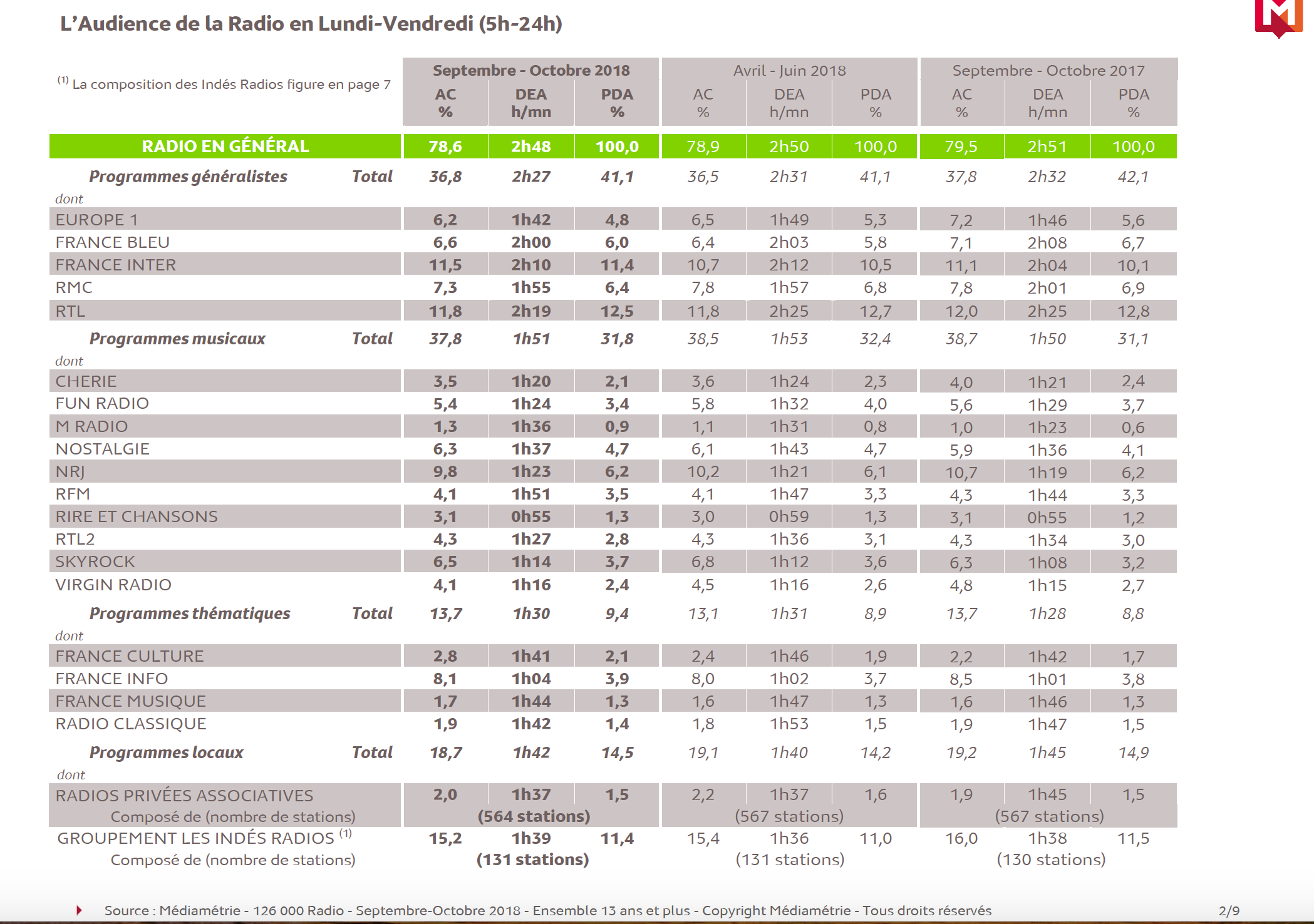 Rappelons que les résultats de l'enquête 126 000 Radio sont publiés 4 fois par an sur les périodes janvier/mars (sortie mi-avril), avril/juin (sortie mi-juillet), septembre/octobre (sortie mi-novembre) et novembre/décembre (sortie mi-janvier). La semaine prochaine, Médiamétrie dévoilera, le jeudi 22 novembre à 09h00, les résultats de l’enquête 126 000 Radio Ile-de-France pour la période septembre à octobre 2018 qui concernent les audiences des radios parisiennes et franciliennes.