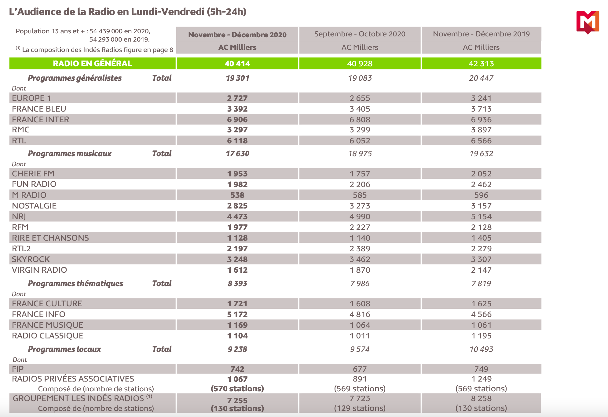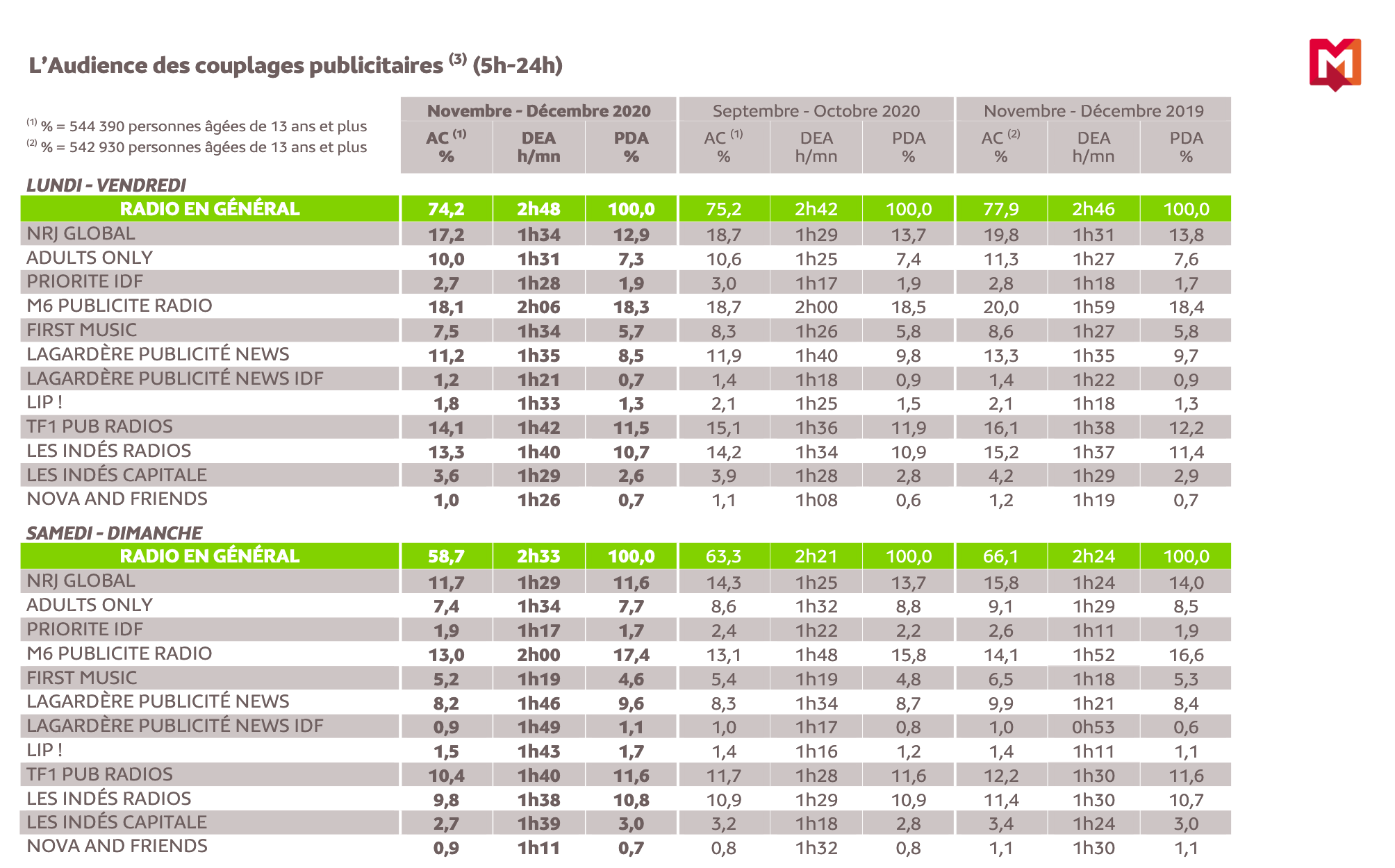 Un deuxième confinement, de nombreux salariés en télétravail, des jours de moindre activité en raison des ponts... La crise sanitaire pèse une nouvelle fois fortement sur les résultats de cette deuxième 126 000 Radio de la la saison. Elle présente les audiences traitées par Médiamétrie en novembre et décembre 2020.