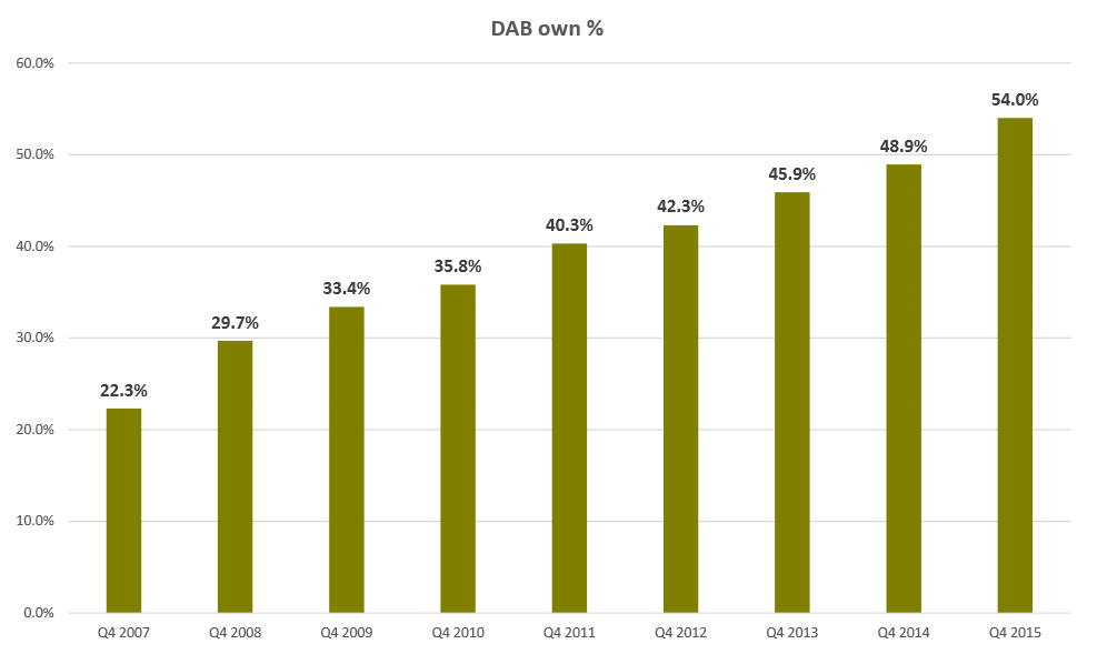 Le poids de la radio numérique terrestre ne cesse de progresser dans la consommation de la radio, et a désormais dépassé son point critique, en devenant même un argument commercial, par exemple dans l'équipement automobile. La RNT pèse désormais 28% de la part d'audience totale, tous supports confondus, contre 25% il y a un an, et 16% il y a 5 ans.