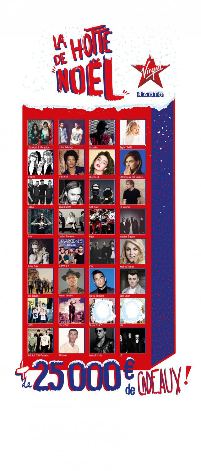Le Père Noël est passé plus tôt cette année chez Virgin Radio en déposant un calendrier de l’avent. Dans ce calendrier, 32 cases avec un artiste Virgin Radio et derrière chaque case un cadeau à gagner : iPad, séjours, PS4, concerts, iPhone 6, 2000 € cash... Plus de 25 000€ de cadeaux à remporter. Les auditeurs peuvent participer à cette hotte de Noël, depuis hier et jusqu'au 24 décembre.