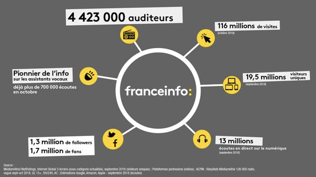 franceinfo réalise également sa meilleure part d’audience depuis 7 ans sur une vague de rentrée, avec 3.9% Part d'Audience et voit sa durée d’écoute moyenne augmenter de 3 min pour atteindre 64 min.