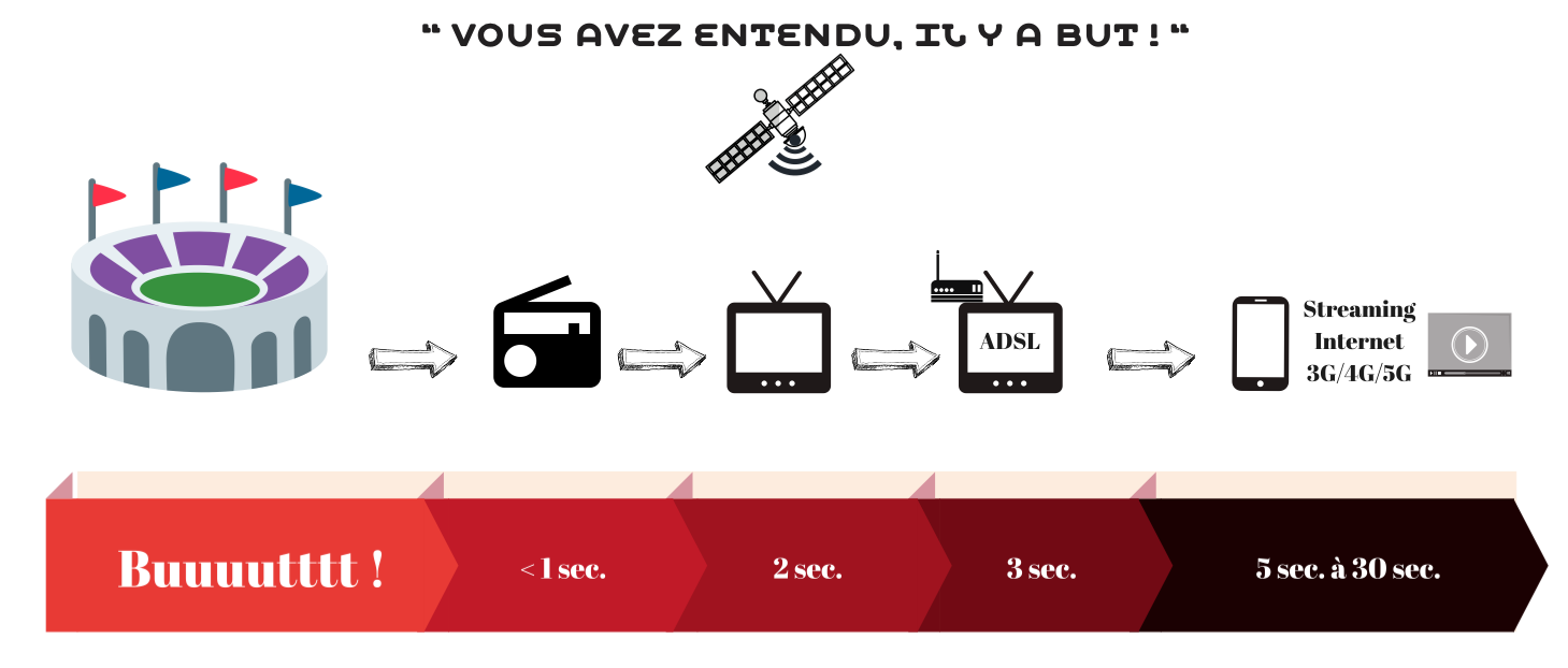 Les autoradios Carplay de série dans les voitures neuves n'y changeront rien. Quand une équipe marque un but, les auditeurs radio le vivent dans la seconde, car le signal est propagé en clair, de manière collective et immédiate sur les ondes. Essayez de vous abonner au streaming de votre radio préférée, un soir de match dans une voiture… Entre les différentes étapes d'encodage, de mise en cache, de transport… puis la qualité de réception de votre réseau mobile à l'instant T, le dernier caprice de votre carte SIM, les notifications de votre téléphone qui viennent polluer l'écoute… Avec un peu de chance, les klaxons de vos voisins d'embouteillage vont donneront une vague idée du score avant même que le penalty ne soit tiré.