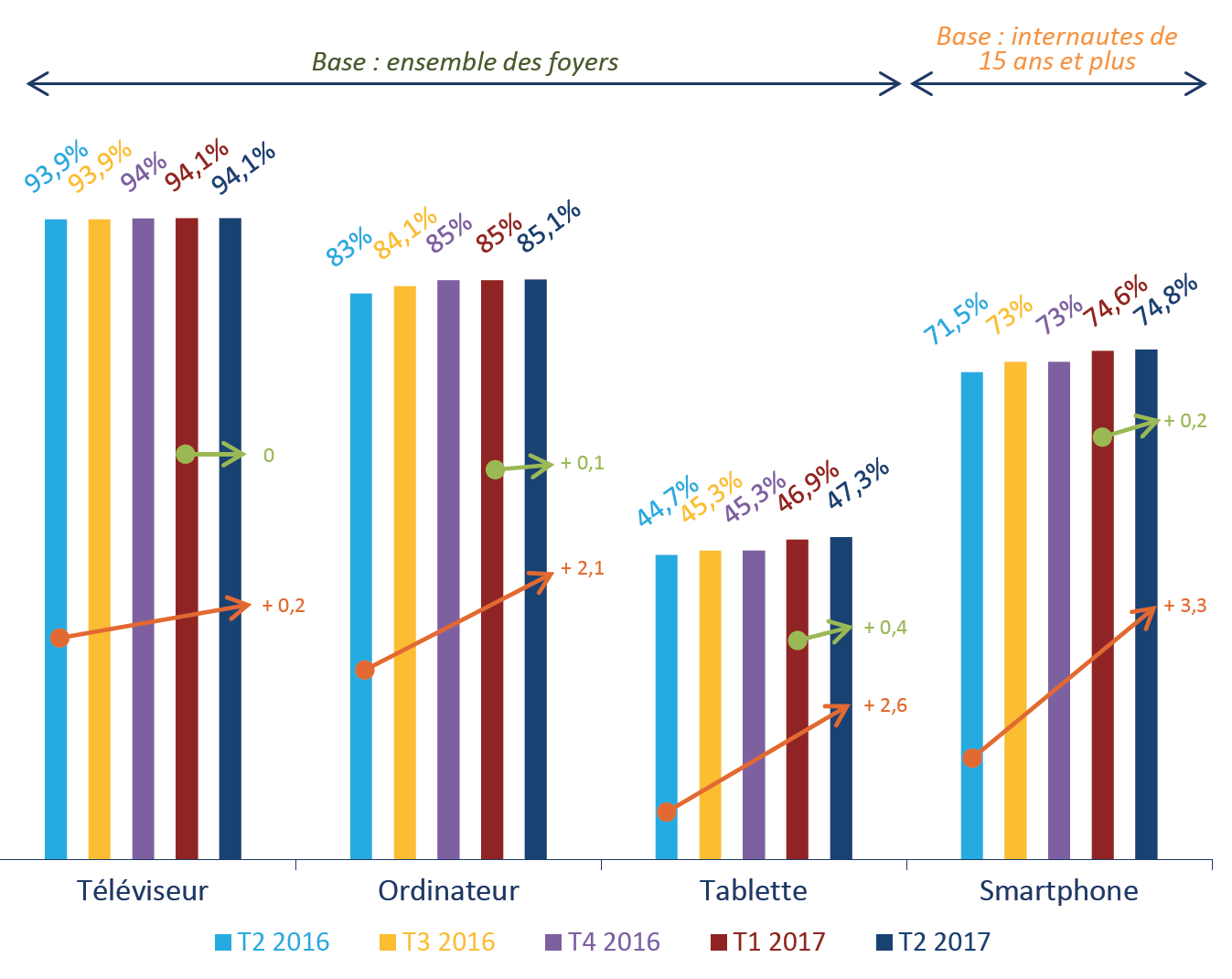 Depuis trois ans, le nombre moyen d’écrans par foyer permettant de regarder des vidéos se stabilise autour de 5.5 écrans. Les foyers ne consomment plus seulement de contenus audiovisuels depuis leur téléviseur, mais aussi sur leur téléphone, tablette ou ordinateur. "Cette évolution va de pair avec une autre tendance confirmée par les résultats publiés par l’Observatoire : les célibataires, les jeunes, les CSP+, ainsi que les citadins se passent plus facilement que les autres de téléviseur" note le CSA. Au-delà de cette évolution spécifique à certaines catégories de foyer, "le téléviseur reste la star des foyers métropolitains avec un taux de pénétration stable et voisin de 94 %". Ceux-ci sont de plus en plus connectables et connectés.