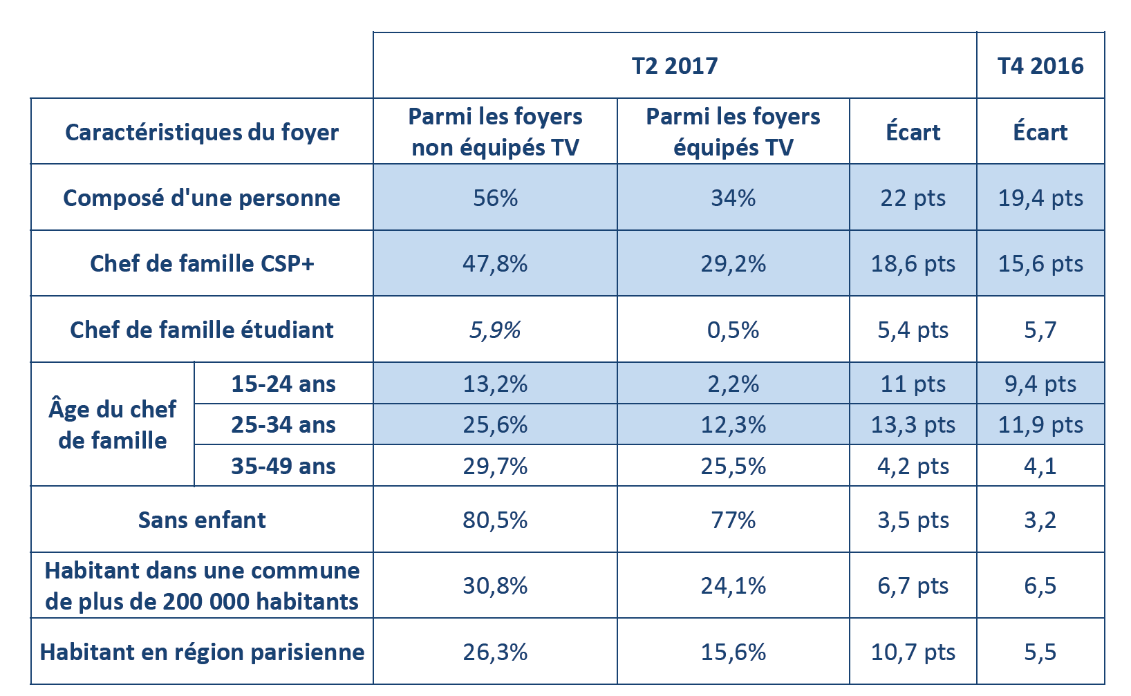 Les foyers d’une seule personne, les jeunes, les CSP+ et les citadins ont tendance à moins s’équiper en téléviseur