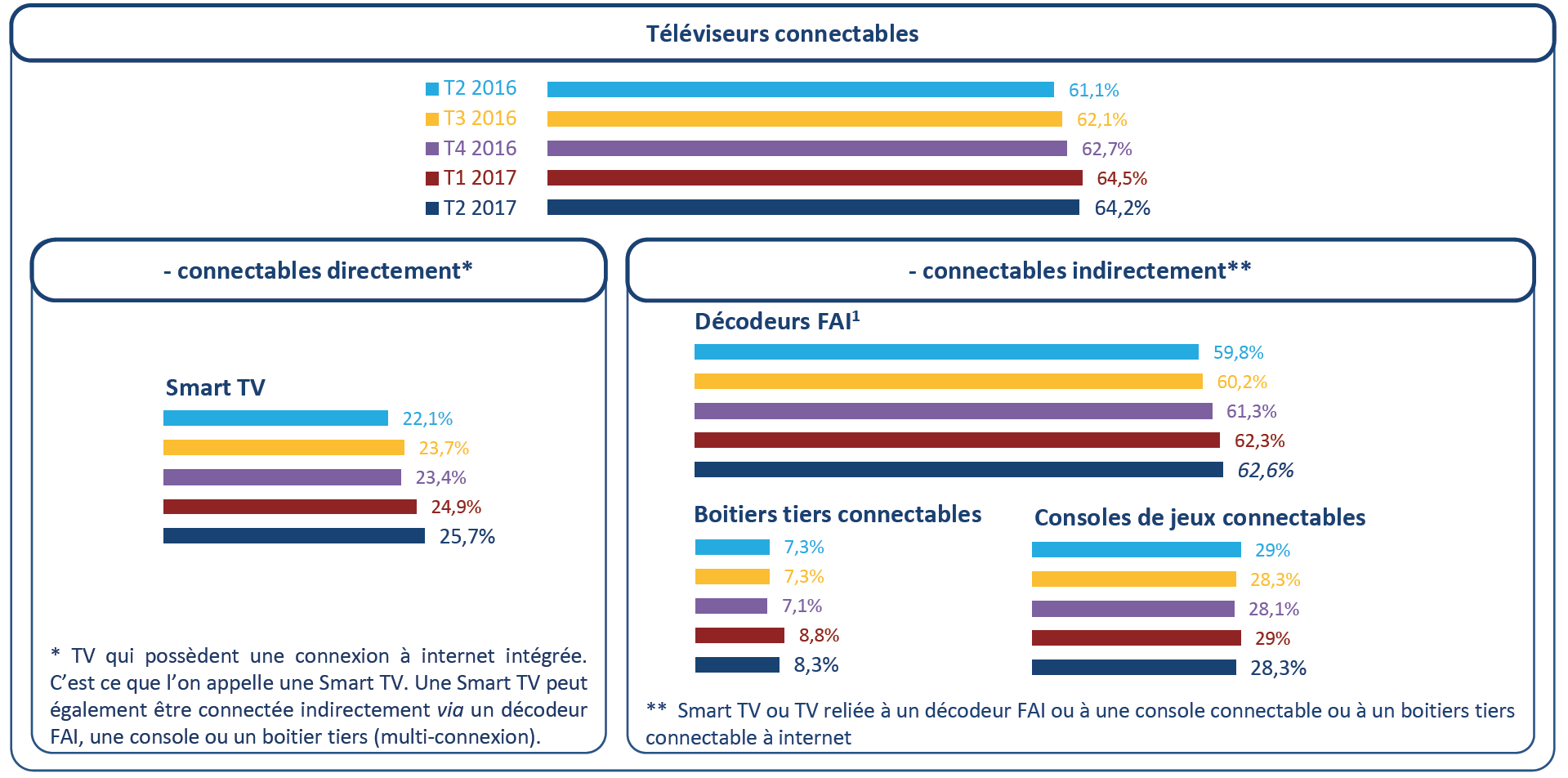 Mi-2017, près des deux tiers des foyers disposaient d’un ou plusieurs téléviseurs connectables à internet. Enfin, si la réception de la télévision par antenne râteau reste encore majoritaire (56.3 % des foyers), internet devient un mode de réception de plus en plus commun. La combinaison de ces deux modes de réception est d’ailleurs fréquente.