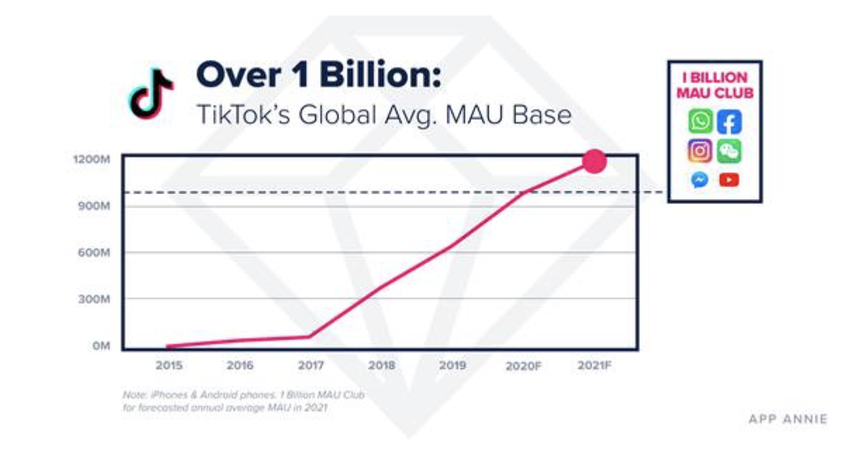 TikTok a connu une forte croissance du nombre d'utilisateurs actifs par mois en 2020 triplant quasiment sa présence mondiale depuis 2018. En 2021, l’application ne devrait pas seulement atteindre la barre des 1 milliard d'utilisateurs actifs par mois mais atteindre celle des 1,2 milliard. Parmi les autres applications ayant atteint les 1 milliards d’utilisateurs actifs par mois figurent Facebook, WhatsApp et WeChat. Au troisième trimestre 2020, TikTok était la deuxième meilleure application (hors applications gaming) en matière de revenus. Cela témoigne de l'ampleur et de la solidité de l'engagement de ses utilisateurs. TikTok se démarque des autres applications de réseaux sociaux, qui monétisent principalement grâce aux recettes publicitaires.
