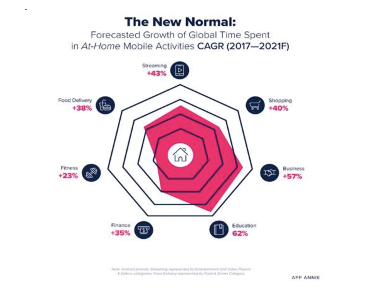Le mobile est devenu notre porte de sortie vers le monde extérieur et le temps passé sur les applications des catégories « activités à domicile » devrait dépasser 1.3 milliard d'heures dans le monde sur Android en 2021. En 2021, App Annie prévoit en effet une explosion et une prépondérance des activités à domicile. Ce dernier sera l’épicentre de nos activités sociales et professionnelles.