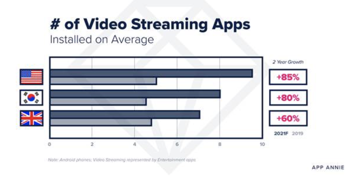 Alors que les confinements se sont étendus sur plusieurs mois, les consommateurs du monde entier ont cherché à se divertir à travers le streaming. En France, sur la période de Janvier à Septembre Disney, Disney+ arrive en tête suivi de Netflix et Amazon Prime Vidéo. App Annie prédit que les consommateurs américains auront en moyenne 9,5 applications de streaming vidéo installées sur leur téléphone en 2021, soit une augmentation de 85 % par rapport à 2019. Face à la demande croissante en contenus, de nouvelles applications de streaming ont vu le jour. L’application Shudder, disponible à moins de 5 dollars par mois, complète les plus grandes applications de streaming en proposant un contenu exclusivement basé sur des fictions fantastiques et d’horreur. Aussi, Disney+ a lancé GroupWatch, une application qui s'inscrit dans la tendance actuelle en proposant aux utilisateurs de visionner simultanément des contenus avec leurs amis tout en étant séparés.