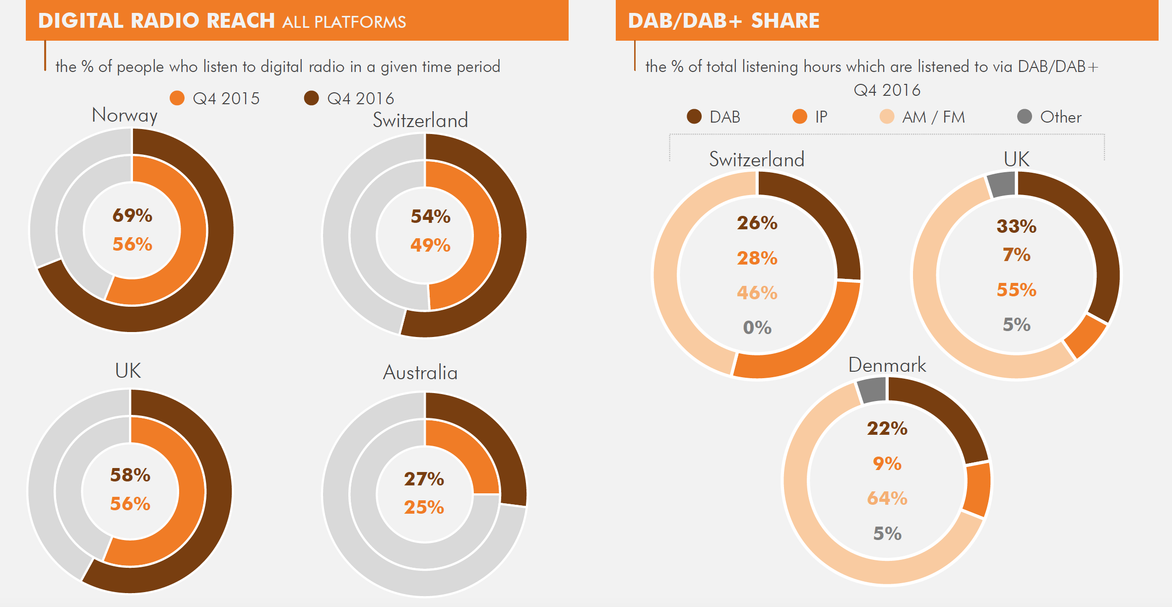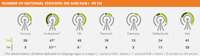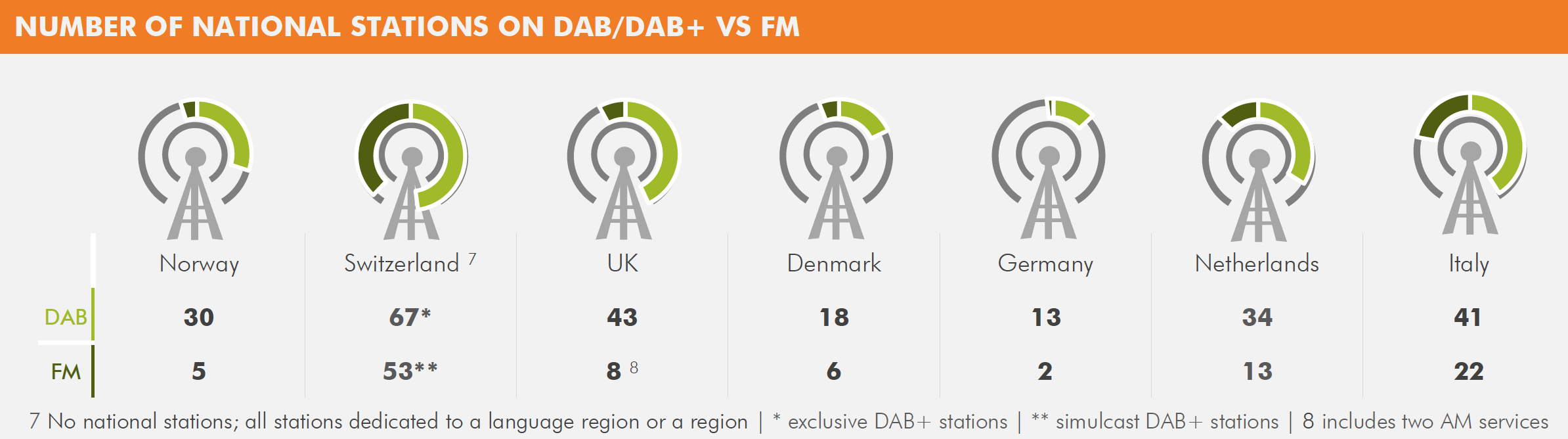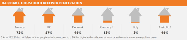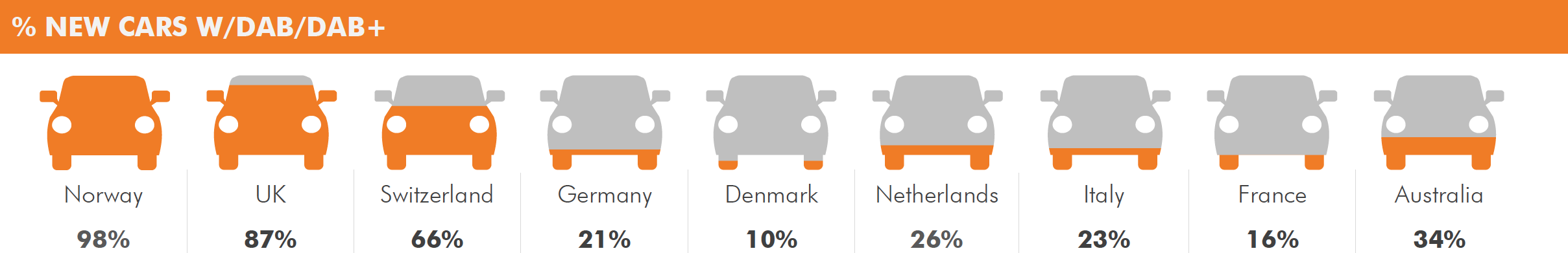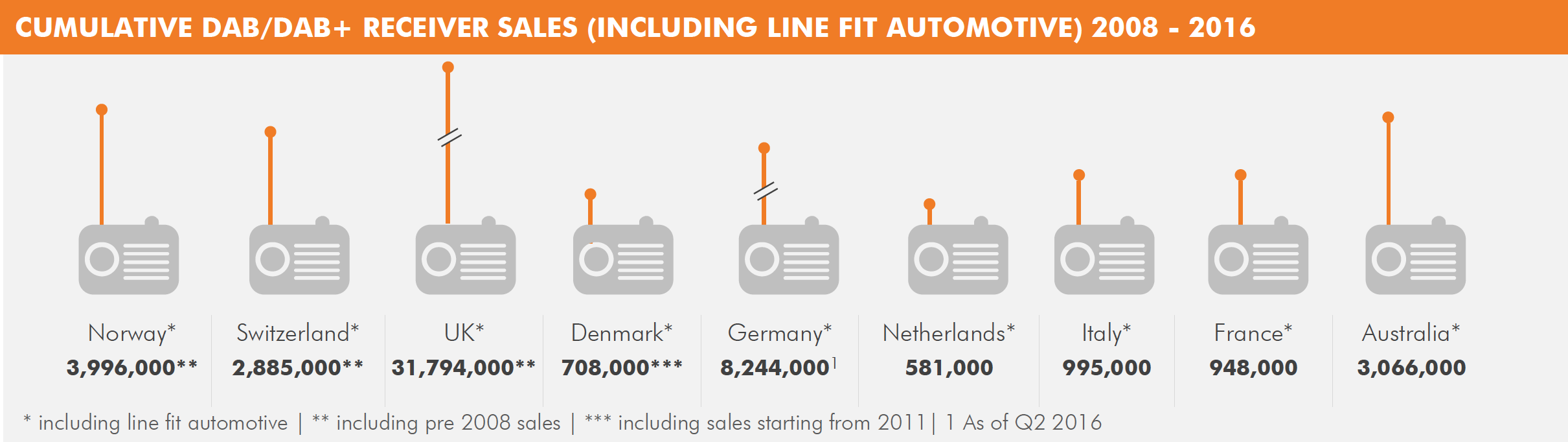 Plus de 53 millions de récepteurs (incluant la première monte automobile) ont été vendus dans le monde. L’installation de série du DAB+ dans les voitures neuves continue de croître. En Norvège, 98% des voitures neuves sont vendue avec le DAB), un nombre qui descend à 87% au Royaume-Uni et à 66% en Suisse. La couverture de la population couverte par un signal DAB est, elle aussi, en augmentation : 99.7% pour la Norvège, 99.5% pour la Suisse, 98% pour le Danemark, 97% pour le Royaume-Uni, 96% pour l'Allemagne et 95% pour les Pays-Bas. La vague de pays se développe assez rapidement puisque ce sont maintenant 23 pays ayant des services DAB qui sont présentés dans cette infographie