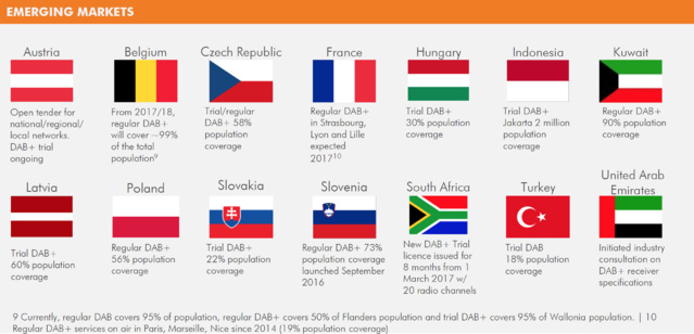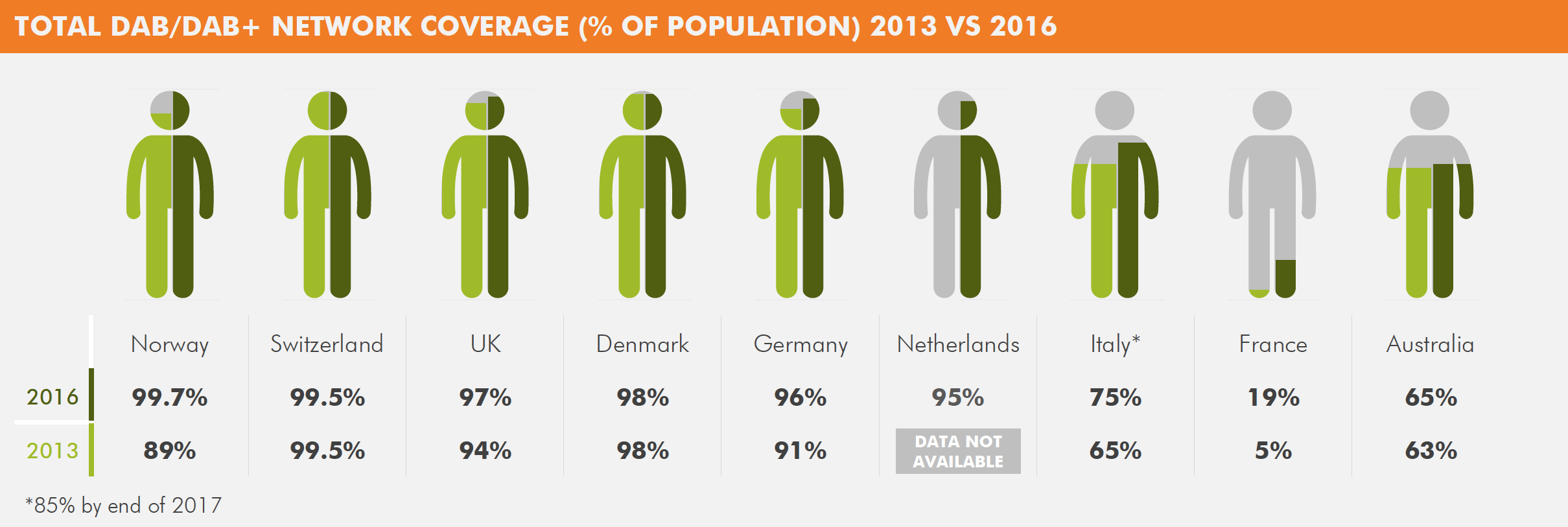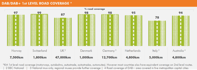 Plus de 53 millions de récepteurs (incluant la première monte automobile) ont été vendus dans le monde. L’installation de série du DAB+ dans les voitures neuves continue de croître. En Norvège, 98% des voitures neuves sont vendue avec le DAB), un nombre qui descend à 87% au Royaume-Uni et à 66% en Suisse. La couverture de la population couverte par un signal DAB est, elle aussi, en augmentation : 99.7% pour la Norvège, 99.5% pour la Suisse, 98% pour le Danemark, 97% pour le Royaume-Uni, 96% pour l'Allemagne et 95% pour les Pays-Bas. La vague de pays se développe assez rapidement puisque ce sont maintenant 23 pays ayant des services DAB qui sont présentés dans cette infographie.