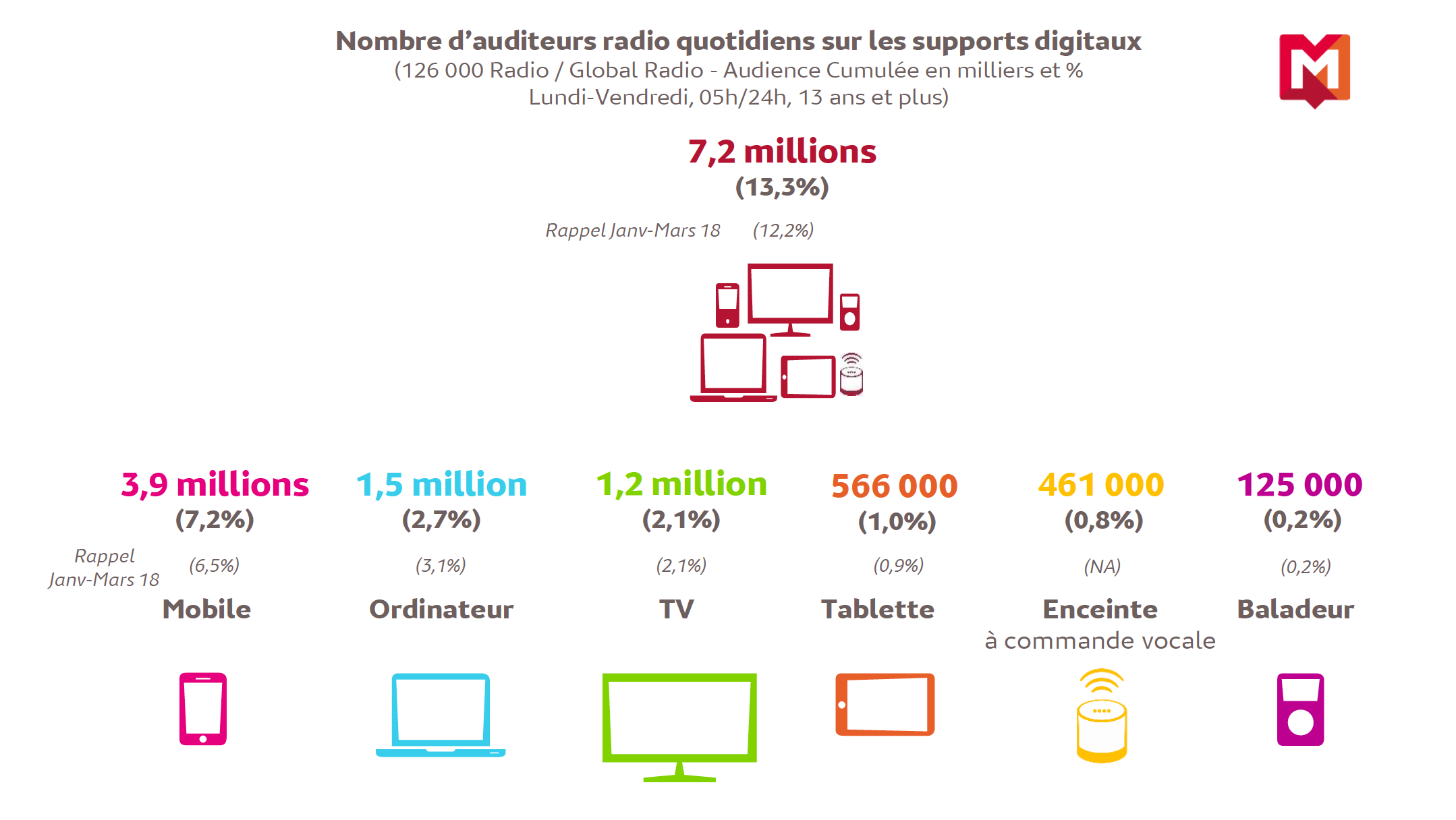 Le module Global Radio de l’enquête 126 000 Radio permet d’analyser les comportements d’écoute numérique de la radio. La nouvelle édition révèle que 13.3% des Français de 13 ans et plus, soit 7.2 millions de personnes, écoutent chaque jour la radio sur un support digital. Un niveau record, en progression de 1.1 point sur un an. Le téléphone mobile reste le premier des supports numériques utilisés pour écouter la radio avec 3.9 millions d’adeptes quotidiens. Viennent ensuite l’ordinateur (1.5 million d’auditeurs), la télévision (1.2 million), la tablette (566 000) et le baladeur (125 000). L’écoute de la radio sur les enceintes à commande vocale progresse et rassemble en moyenne 461 000 auditeurs quotidiens. Par ailleurs, chaque jour 2 millions d’individus écoutent la radio en replay, pour une durée de 1h02 en moyenne par jour et par auditeur.