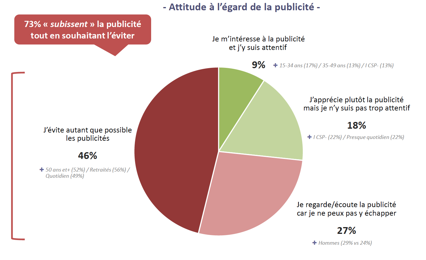 Alors que faut-il retenir de cette étude Ifop ? Les auditeurs réguliers de Radio France sont relativement peu favorables à la publicité : 73% y donc sont plutôt hostiles. La faible présence de la publicité est ainsi la première motivation pour l’écoute des stations de Radio France (83%), devant devant même l’exclusivité des programmes du groupe public.