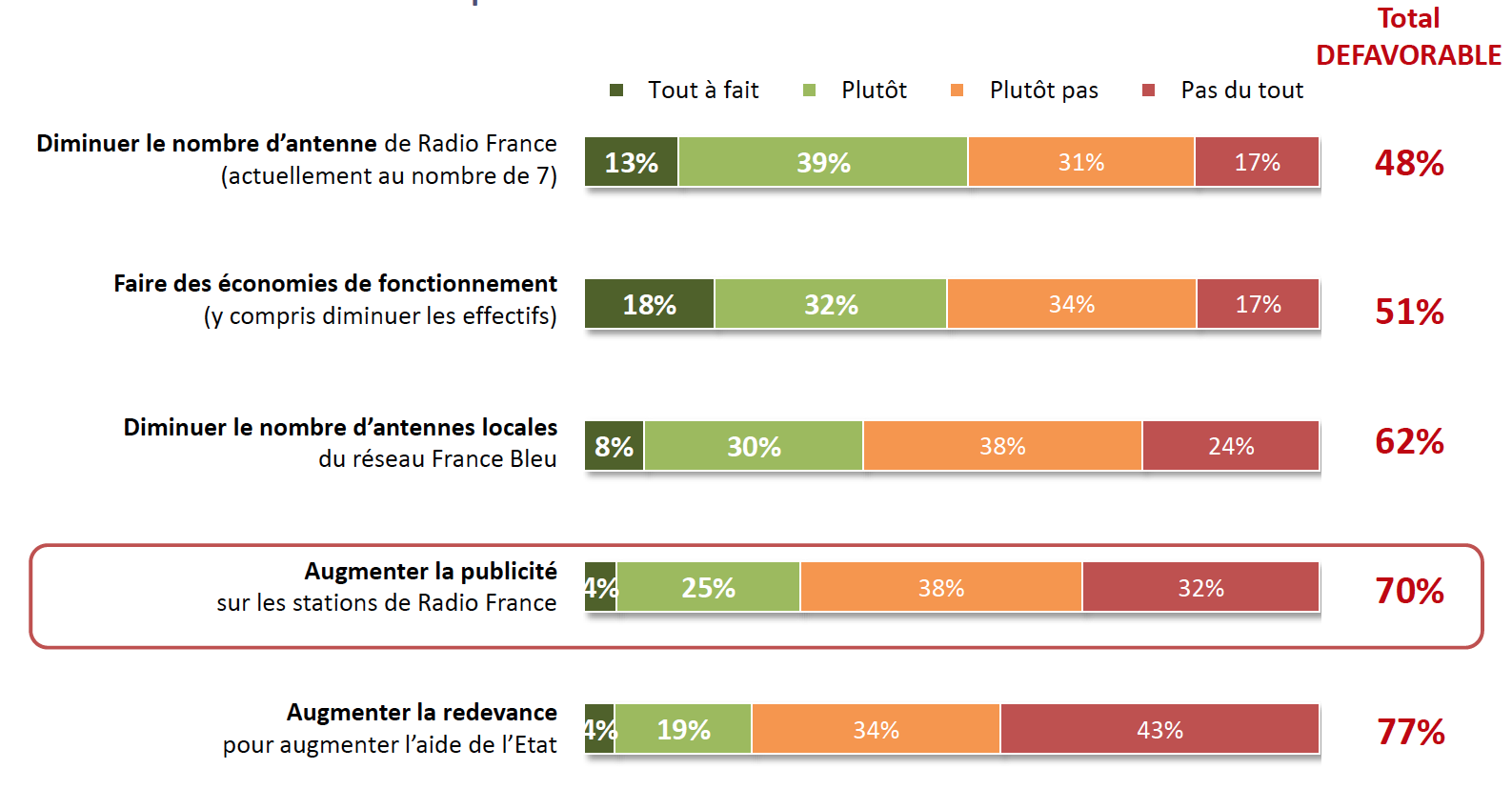 "Pour affronter les difficultés économiques de Radio France, ses auditeurs refusent la facilité de l’augmentation de la publicité et préfèrent des économies. Pour près de la moitié d’entre eux, la diminution du nombre d’antennes et des économies de fonctionnement (y compris une diminution des effectifs) sont des solutions auxquelles ils sont favorables. La subvention annuelle de Radio France de plus de 600 M€ est supérieure à l’ensemble des recettes des radios privées nationales françaises. Ces ressources publiques justifient pleinement le maintien de la limitation de la publicité sur les antennes publiques en regard du cahier des charges de Radio France" a expliqué hier le Bureau de la Radio.