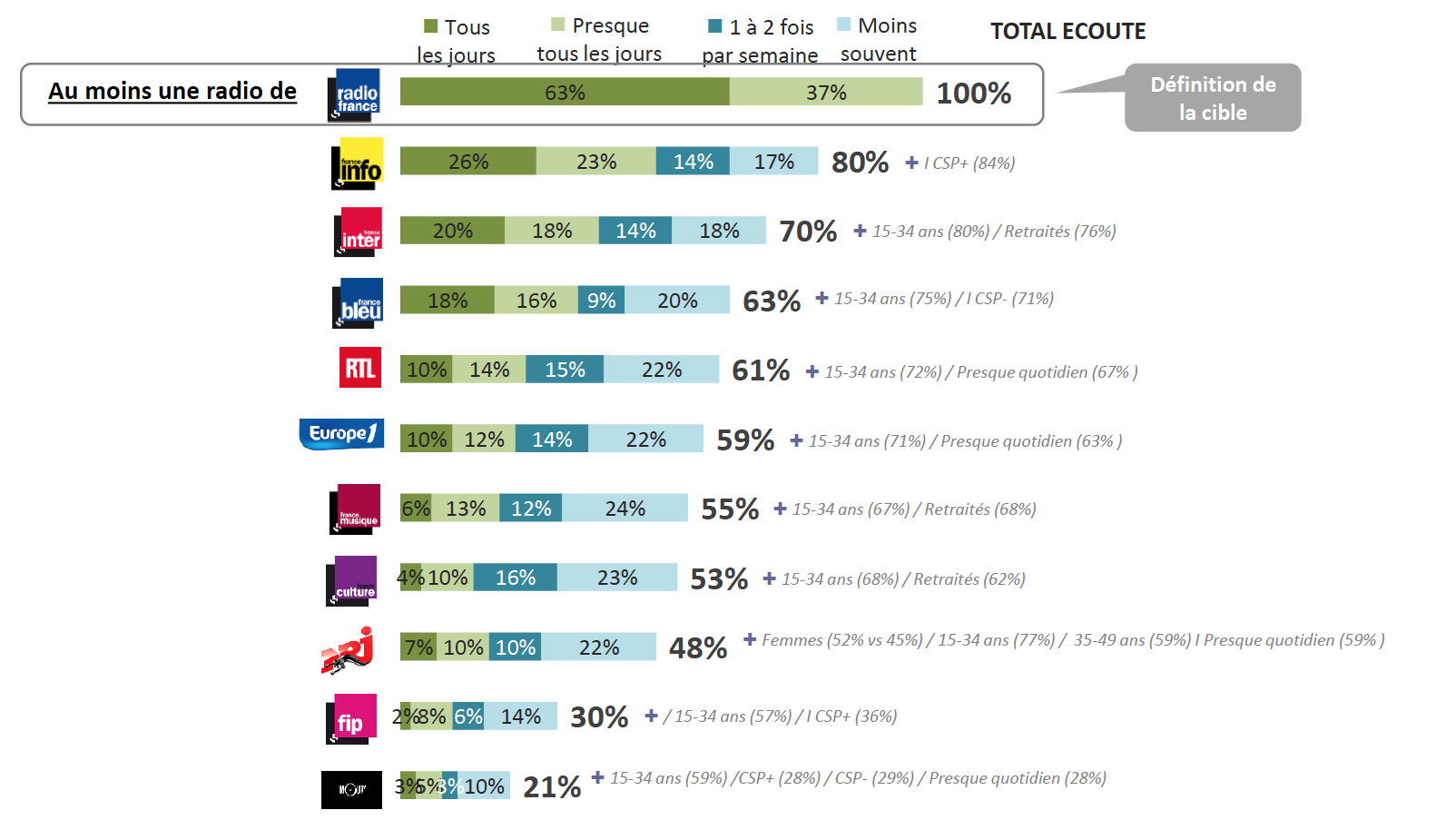 Et dans le cas d’une augmentation de la publicité sur les antennes de Radio France, 72% écouteraient moins les stations du groupe public (17% beaucoup moins).