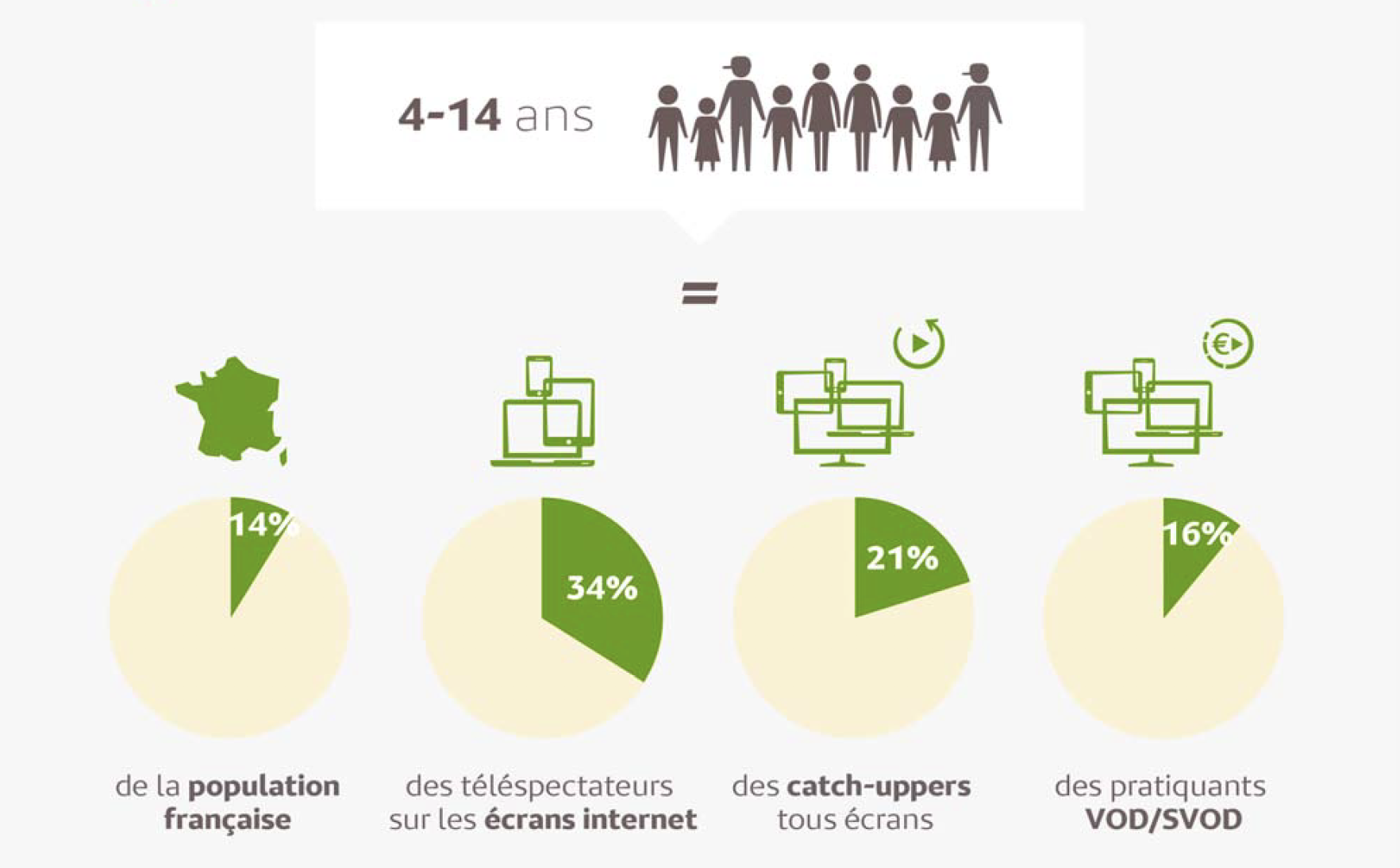 Soulignons que, selon Médiamétrie, 1/3 des 4-14 ans sont friands de ces nouveaux usages – replay hors téléviseur, TV sur écrans internet ou VOD/SVOD – soit 2,9 millions d’entre eux. Ce sont eux qui tirent l’ensemble de ces nouvelles pratiques vers le haut. Et si les 4-14 ans ne représentent que 14% de la population française, plus d’un tiers des consommateurs de programmes TV hors téléviseur a moins de 15 ans.