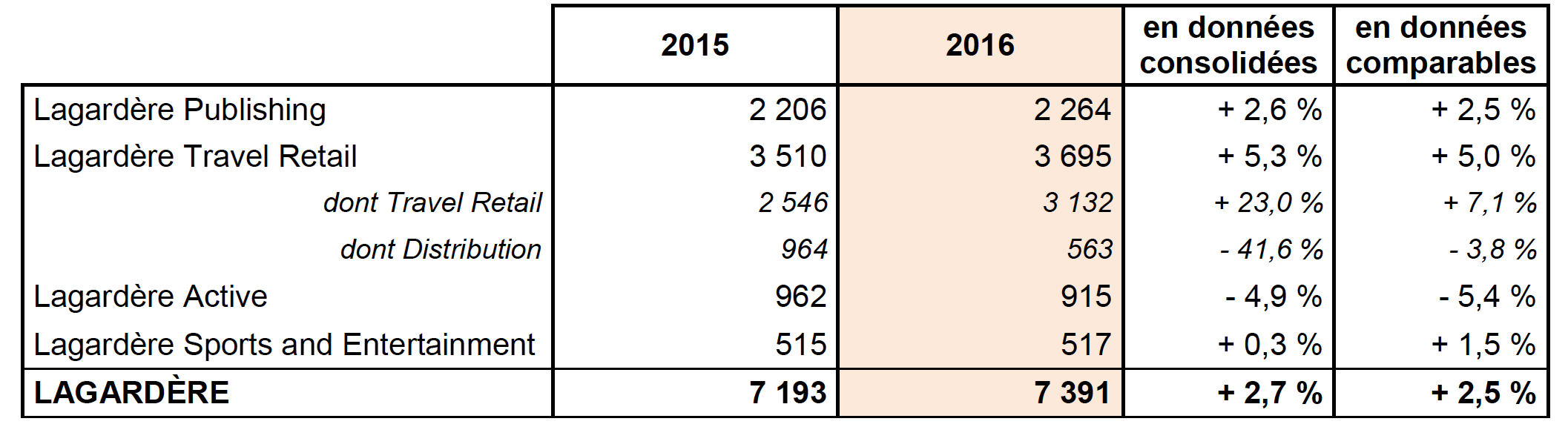 Le chiffre d’affaires 2016 de Lagardère Active s’établit à 915 M€ en 2016. 0Le recul de l’activité est principalement lié à la baisse de la Presse Magazine (- 7,4 %) dans les tendances du marché, ainsi qu’à une base de comparaison défavorable pour Lagardère Studios (- 7,6 %) du fait d’une forte activité de vente de droits en 2015. Les radios musicales ont connu une bonne dynamique tant en France qu’à l’international, avec un chiffre d’affaires publicitaire en croissance de + 5,5 %. En 2016, le chiffre d’affaires Publicité a enregistré une baisse de - 4,0 % comparé à 2015 sur l’ensemble de la branche.