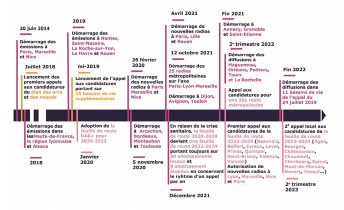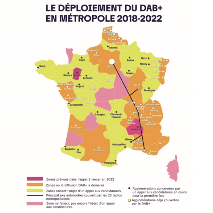 Depuis 2014, le DAB+ se déploie dans l’Hexagone. Déjà en service dans 10 métropoles régionales, le DAB+ accroît sa couverture le 12 octobre 2021 par la première phase de déploiement de 25 radios métropolitaines, le long de l’axe Paris-Lyon-Marseille et par le démarrage des émissions à Avignon, Dijon et Toulon. Cette date constitue une étape importante de la mise en œuvre du plan de l’Arcom dit des "nœuds et des arcs", visant à accélérer le déploiement du DAB+ en France.