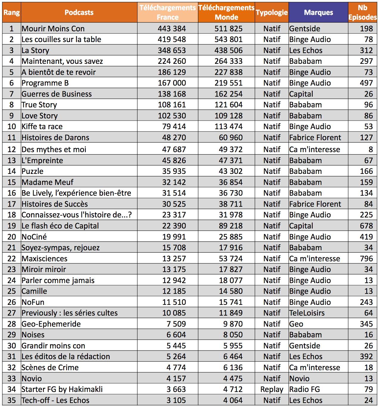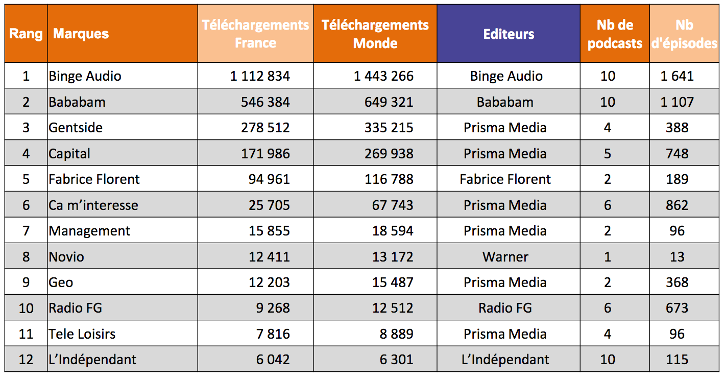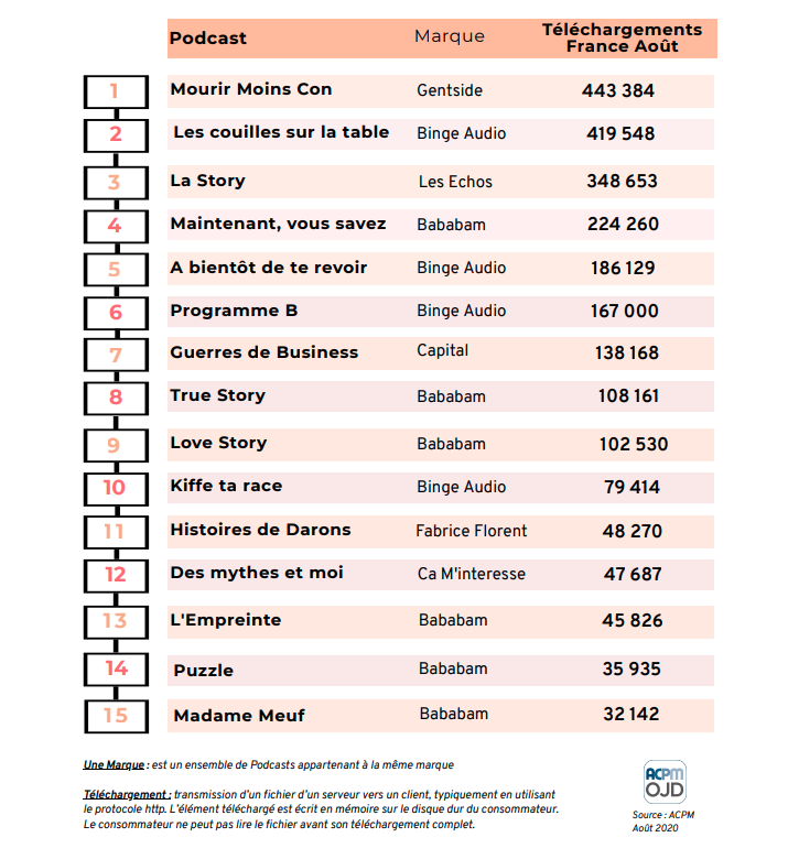 Il faut souligner que, suite au classement pilote du mois de juin dernier (lire ICI), l'ACPM a enregistré de nombreuses adhésions, au cours de l’été, d’éditeurs de Podcasts tels que Bababam et Fabrice Florent, ainsi que Les Echos et L'Indépendant. Par ailleurs, un acteur majeur de la radio, Radio FG, a soumis ses podcasts dits de "Replay" à la certification. En juillet (1 112 834) comme en août (945 211), Binge Audio est le studio dont les podcasts sont les écoutés. En juillet, le célèbre podcasts "Les couilles sur la tables" est le podcast le plus écouté avec 440 942 téléchargements depuis la France.
