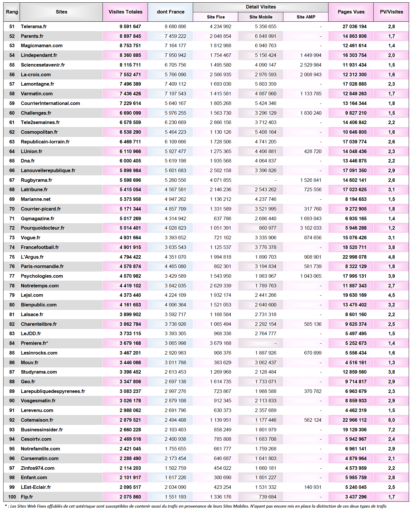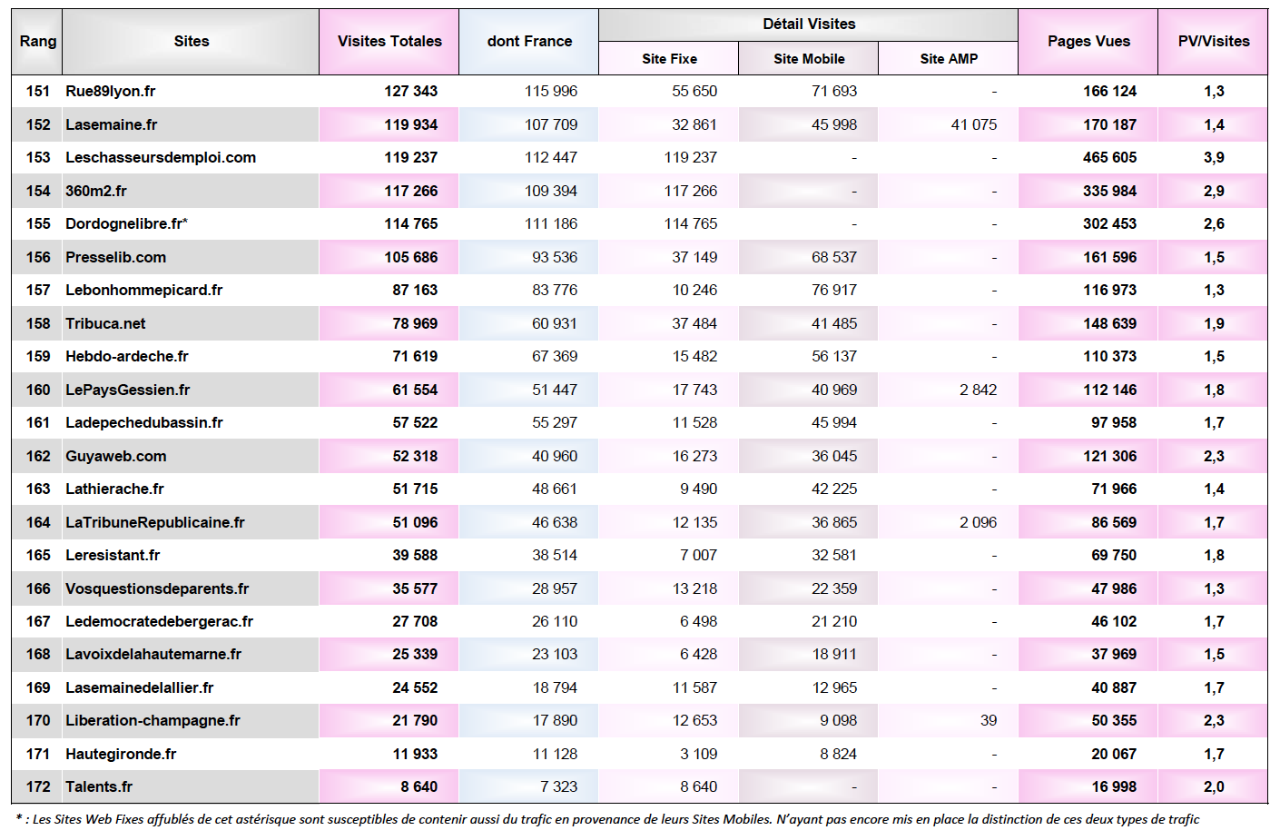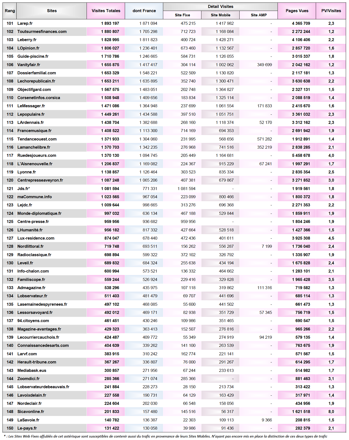 Dans le classement des sites fixes et mobiles grand public, c'est plus compliqué puisque ce classement est notamment trusté par les sites de la presse en générale et régionale en particulier.