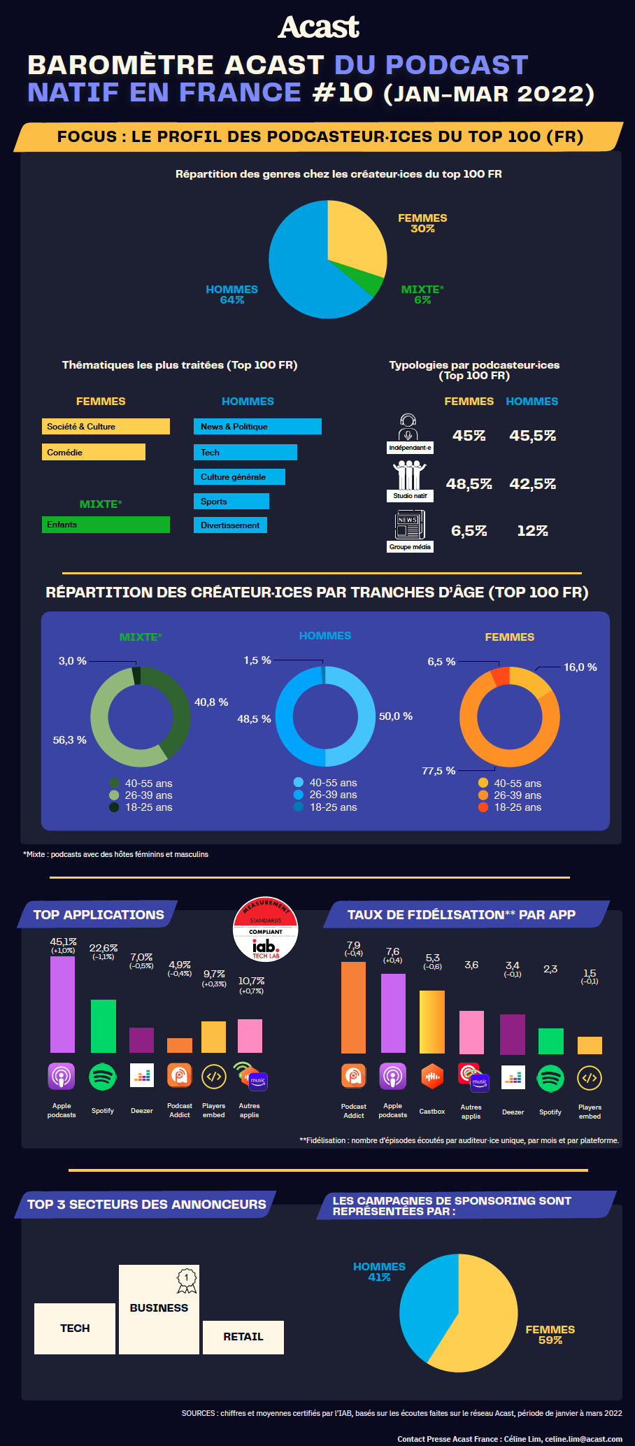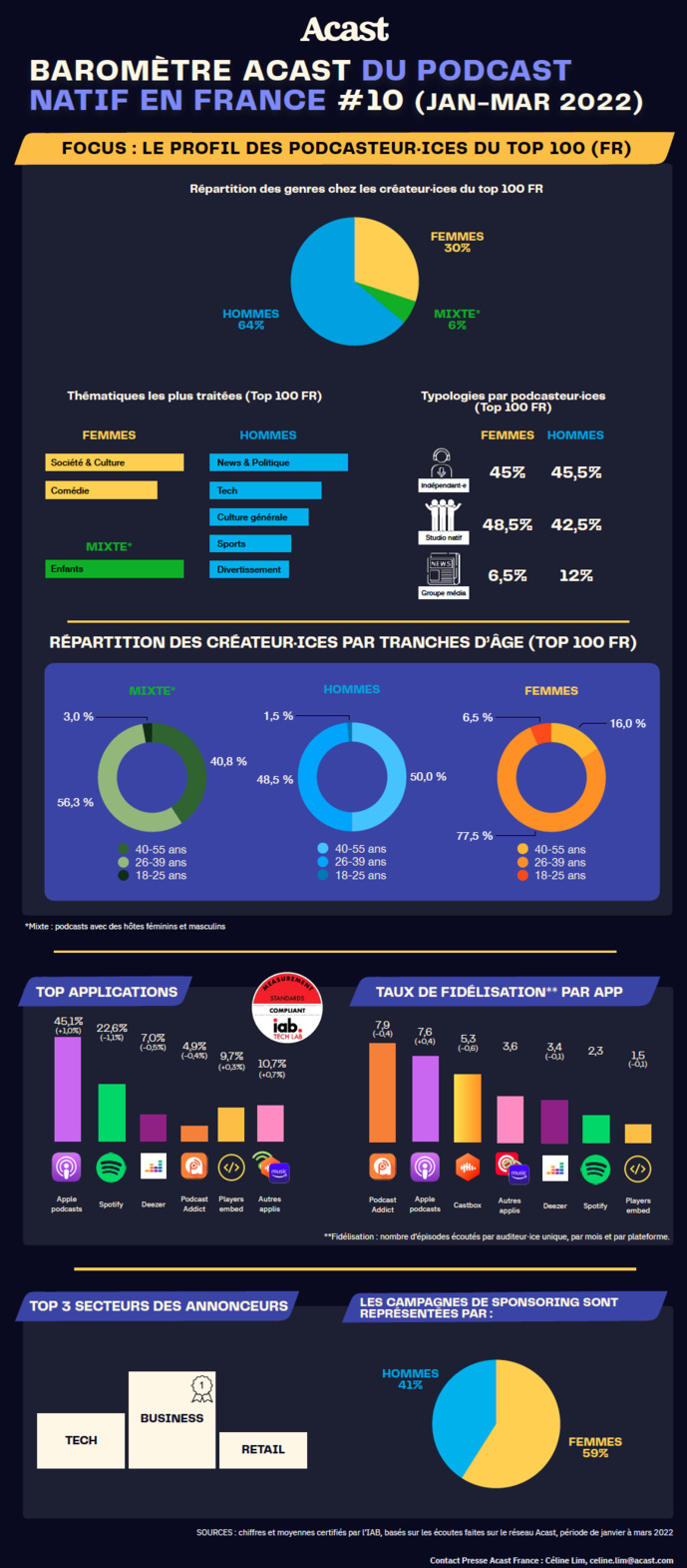 Malgré une légère baisse sur le nombre d’épisodes écoutés par auditeurs unique, par mois et par plateforme, les amoureux·ses des podcasts sont toujours aussi fidèles sur les plateformes dédiées : avec 7.9 épisodes écoutés par auditeur par mois sur Podcast Addict (-0,4 épisode), 5,3 épisodes sur Castbox (-0,6 épisodes). Apple Podcast tire son épingle du jeu avec une moyenne de 7.6 épisodes écoutés par auditeur par mois soit une hausse de +0.4 épisode. Enfin, côté annonceurs, ce sont les entreprises B2B qui investissent le plus en podcast, suivies par les entreprises tech et retail. Et dans les campagnes de sponsoring de ce premier trimestre 2022, la gent féminine est largement représentée à 59% versus les hommes avec 41%.
