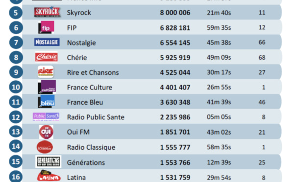 Peu ou pas de grands bouleversements dans le nouveau classement mensuel de l'Alliance pour les Chiffres de la Presse et des Médias. La durée d’écoute de la radio par les canaux digitaux dans le monde progresse de 15% en un an, passant de 88 millions en juin 2018 à près de 101 millions d'heures d'écoute en juin 2019. À noter ce mois-ci, l’entrée de nouvelles radios : Skyrock Casablanca et Fip l’été Metal.