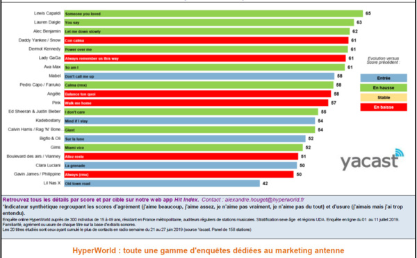 Voici l'agrément des auditeurs aux 20 titres les plus entendus en radio (source Yacast / Panel de 146 stations). Cette nouvelle enquête HyperWorld a été réalisé auprès de 300 répondants entre 15 et 49 ans, menée du 1er au 11 juillet 2019 en France métropolitaine, auprès des auditeurs réguliers de stations musicales.