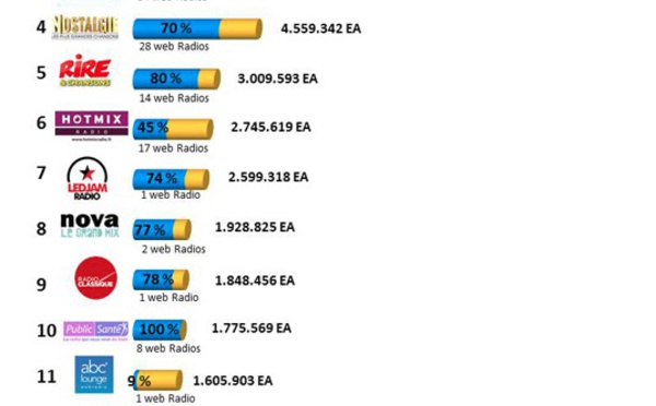 En février dernier, 322 webradios adhérentes ont dépassé les 10 heures de diffusion, sur les 11 908 webradios contrôlées par l'OJD. Sans surprise, NRJ Group domine une nouvelle fois très largement ce Top 15. Seule Skyrock parvient à se hisser à la deuxième place.