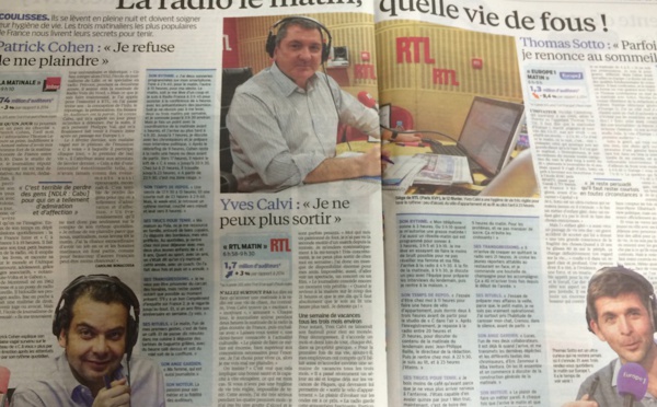 Ce matin, Le Parisien propose une double page consacrée à trois matinaliers: Thomas Sotto (de 6h à 9h sur Europe 1, Yves Calvi (de 6h58 à 9h30 sur RTL) et Patrick Cohen ( de 7h à 9h10 sur France Inter). Chacun partage son rythme, son temps de repos, ses trucs pour tenir ou encore son ange gardien ou encore son moteur.