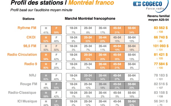 Avec ses 5 stations francophones, CFR (Cogeco Force Radio) attire 80% de la population francophone de Montréal. CFR domine le marché en détenant 62% ou plus de parts de marché commerciales dans chacun des groupes cibles. Sept émissions de CFR se placent parmi les 10 émissions les plus écoutées à la radio.