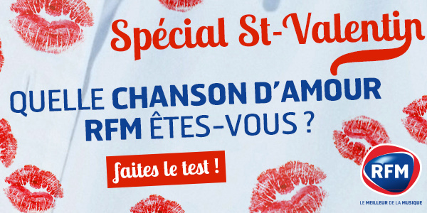 A l'occasion de la Saint-Valentin, RFM lance son "Love Test". Il suffit de répondre aux 10 questions du test RFM et ainsi découvrir quelle chanson d'amour vous correspond... L'auditeur est aussi inviter à partager le résultat sur les réseaux sociaux. A vous de jouer en cliquant sur l'image…