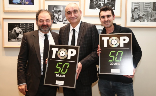Un disque de platine du coffret "Top 50" a été remis hier à Europe 1 par Pascal Nègre à Denis Olivennes et Thomas Joubert d'Europe 1. Une récompense qui salue les 100 000 ventes du coffret de 5 CD pour 100 titres qui ont marqué l'histoire de ce classement.